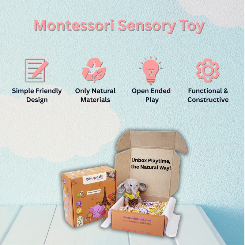 The Bhupadh Elephant Crochet Rattle is designed to introduce babies to sensory play in a calm and reassuring way. The soft crochet texture, gentle rattle sound, and smooth wooden ring support early motor development while offering comfort during teething.