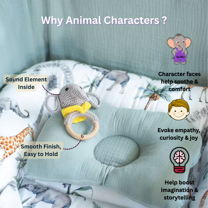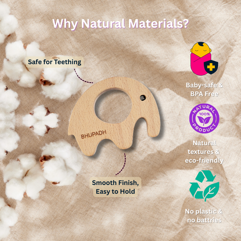 "The Bhupadh Elephant Crochet Rattle with Wooden Teether combines sensory play with soothing teething comfort. The soft crochet texture supports tactile exploration, while the smooth wooden teether helps relieve gum discomfort naturally.